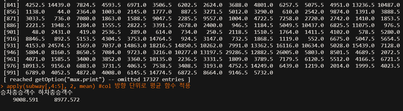apply(subway[,4:5], 2, mean) #col 방향 단위로 평균 함수 적용