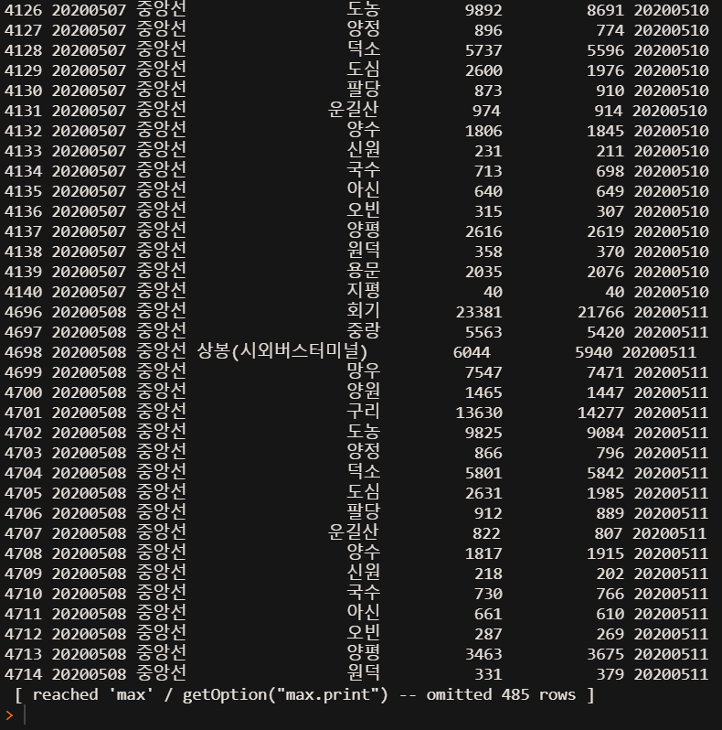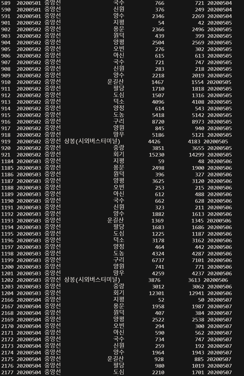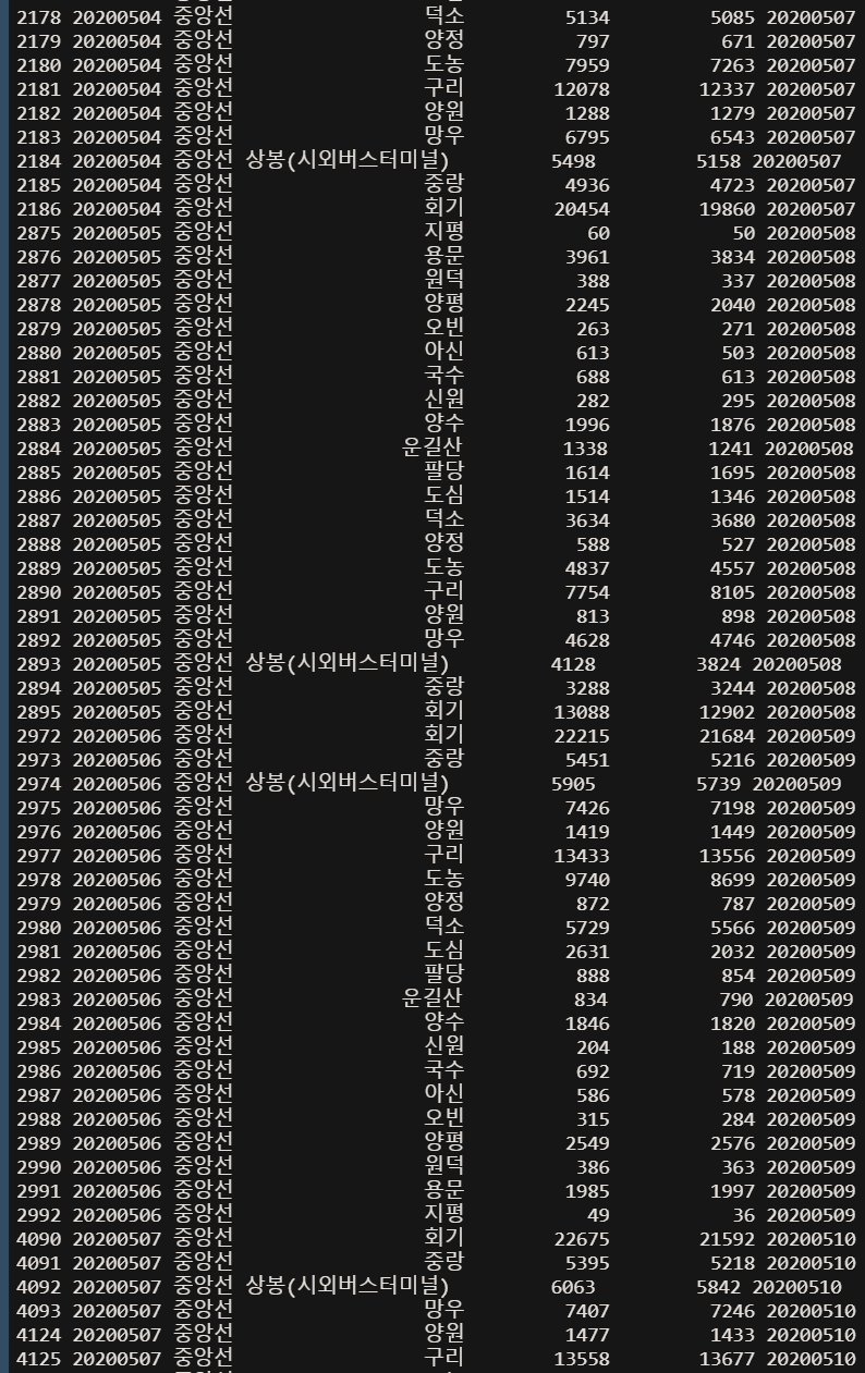 # 노선 == "중앙선" 조건에 만족하는 데이터만 추출함
