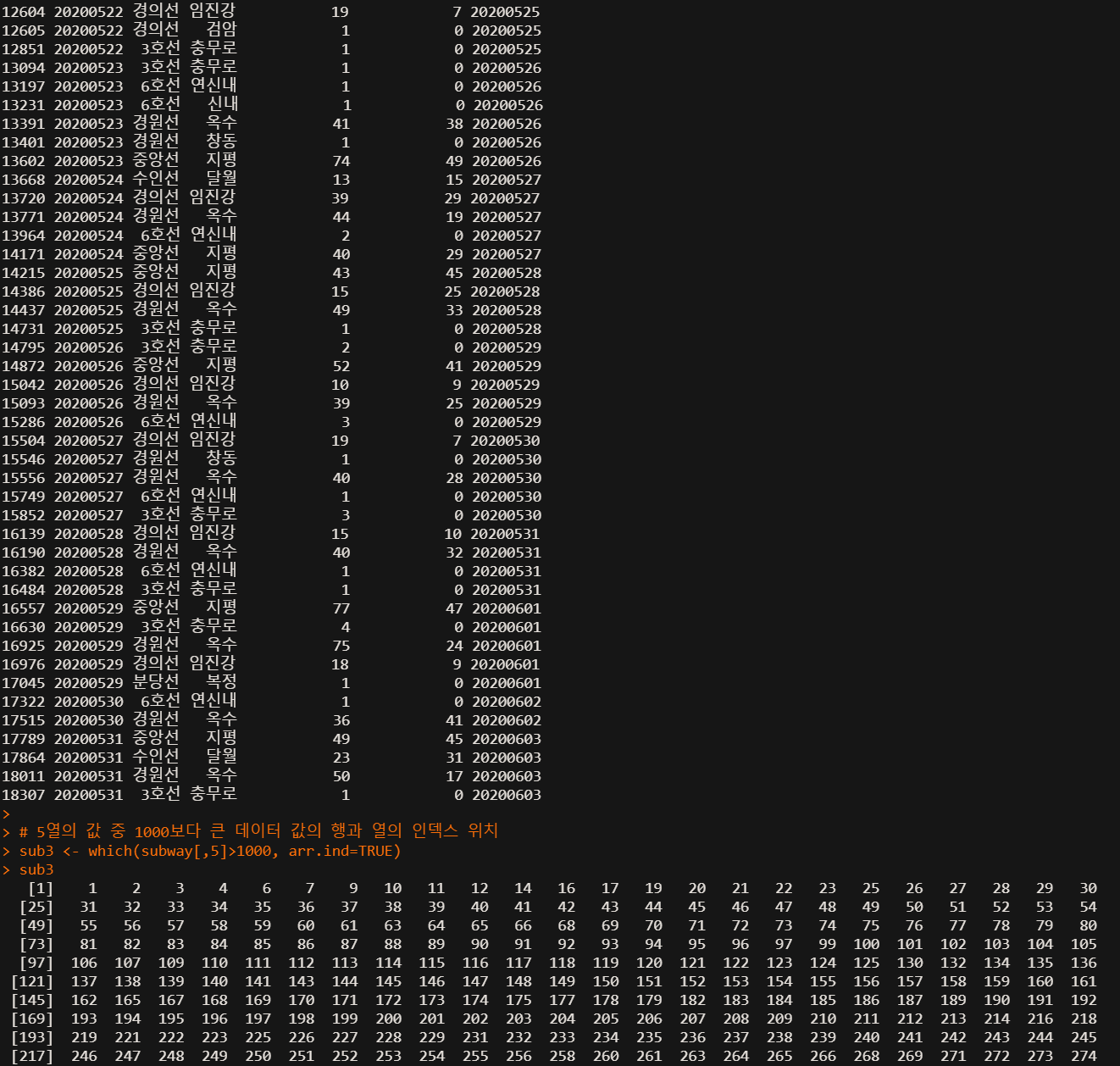 sub3 <- which(subway[,5]>1000, arr.ind=TRUE)
