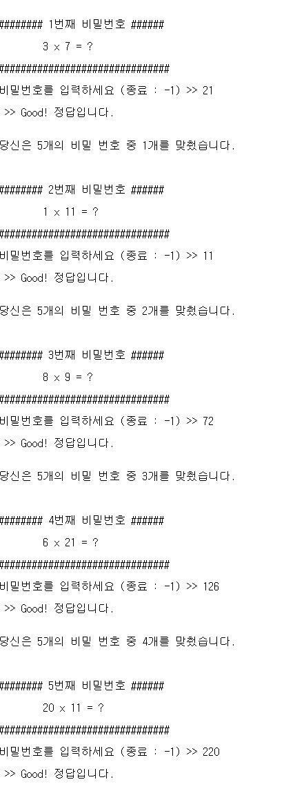 printf("\n비밀번호를 입력하세요 (종료 : -1) >> ");