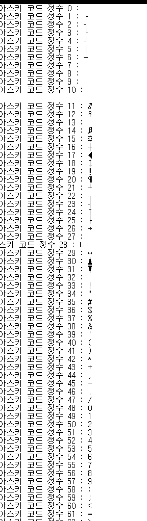 // 참고 2 : 0 ~127 사이의 ASCII 코드 정수 값에 해당하는 문자 확인