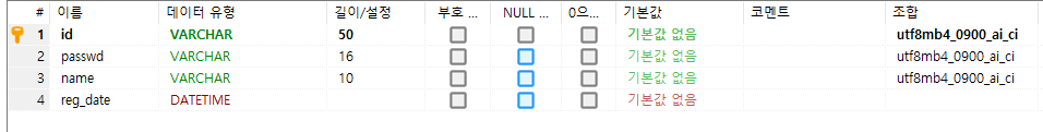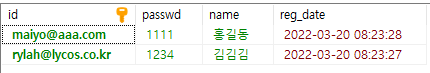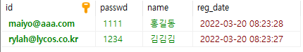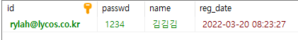 values('rylah@lycos.co.kr', '1234', '김김김', now());