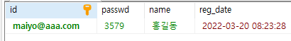 values('maiyo@aaa.com', '1111', '홍길동', now());