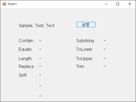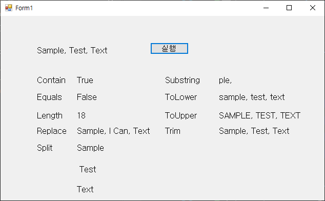 | Split | 문자열을 조건에 맞는 문자열을 기준으로 분할 | strSample.Split(","); | Sample Test Text |