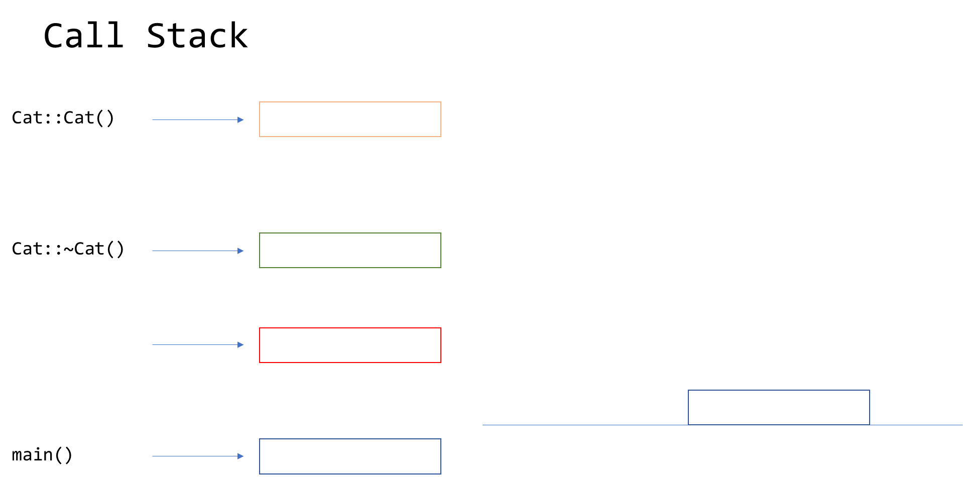 4. addAge(10)이 끝난 이후 값이 변경되었고 그 뒤에 실행되는 함수가 없으니 return으로 가기 전에 소멸자 ~Cat() 한번 메모리 위에 얹어져서 개체 소멸을 진행한다.