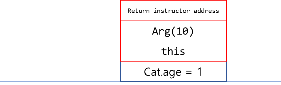 3. cat::Addage() 멤버 함수 호출 return address를 제일 위에 가지며 arg로 넘겨받은 인자와 가장 아래에 객체 자신을 가리키는 this 포인터 주소를 가지는 구조를 갖는다.